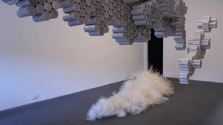 Recently with this body of work I have become engaged with the idea of collecting, using objects that have been accumulated over time by myself and through the help of others. There is something so satisfying about large collections, taking an otherwise throwaway item and holding onto it, transforming it into something else. In line with my work, there is an interesting association that can be made through taking mass produced, functional items and utilising them in an aesthetic way, changing it's function, forcing the viewer to perceive the objects differently. The audience is compelled to see what is not initially seen. As a result of this repetition, along with the simple methods of construction I employ, these installations accumulate and form according to physical tendencies, resulting in associations with "natural" appearance of forms for the viewer. Similarly, the materials assert industrial replication, a constant production of consumer products and waste, highlighting the human tendency towards constant making. This is not an intentional aesthetic; rather it happens through the intuitive process of making, allowing the viewer to delve into the natural world for associations and meaning.