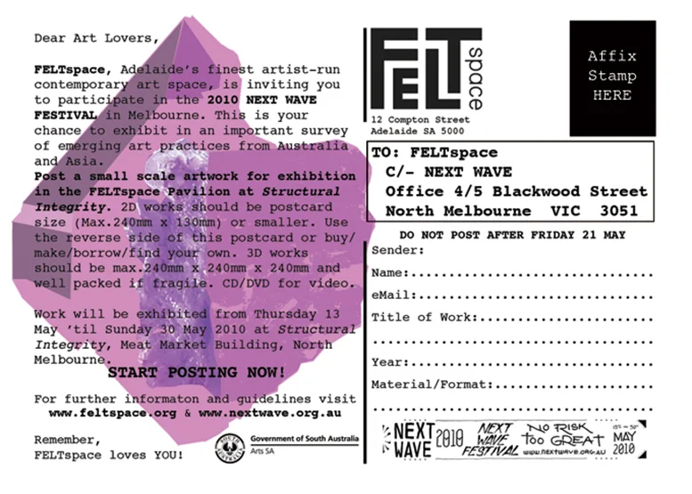 We would love it if as many of you as possible get involved, support FELTspace and promote contemporary art from Adelaide in this national and international context. Your artwork can be posted direct to FELTspace at Next Wave in Melbourne.