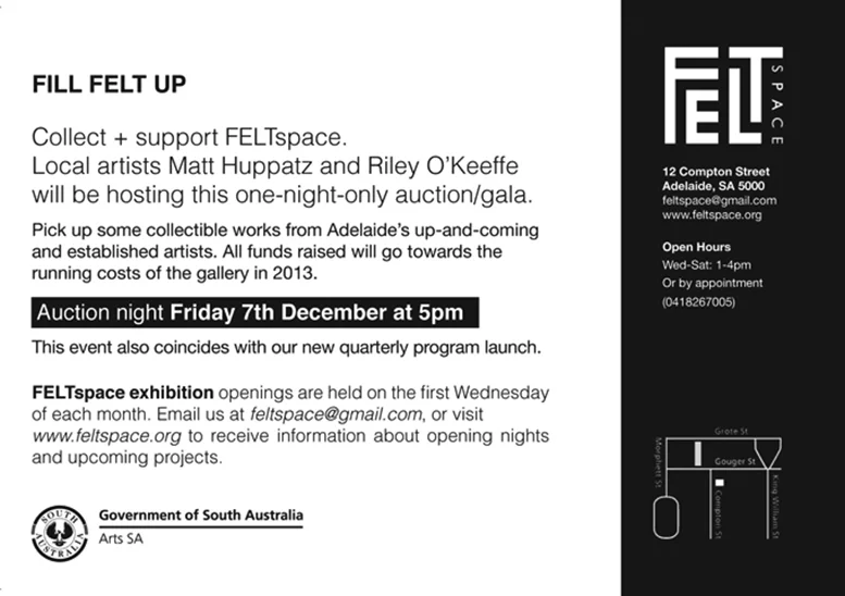 FELTspace would like to invite you to show your support by joining us for this one-night-only auction-gala, comically titled Fill FELT Up. Well-known local artists-come auctioneers, Matt Huppatz and Riley O'Keeffe will be hosting this black tie event at FELTspace on Friday, 7 December 2012. Works can be viewed from 5pm, with formal auction commencing at 6pm. Place your bid and donate to Fill FELT Up!