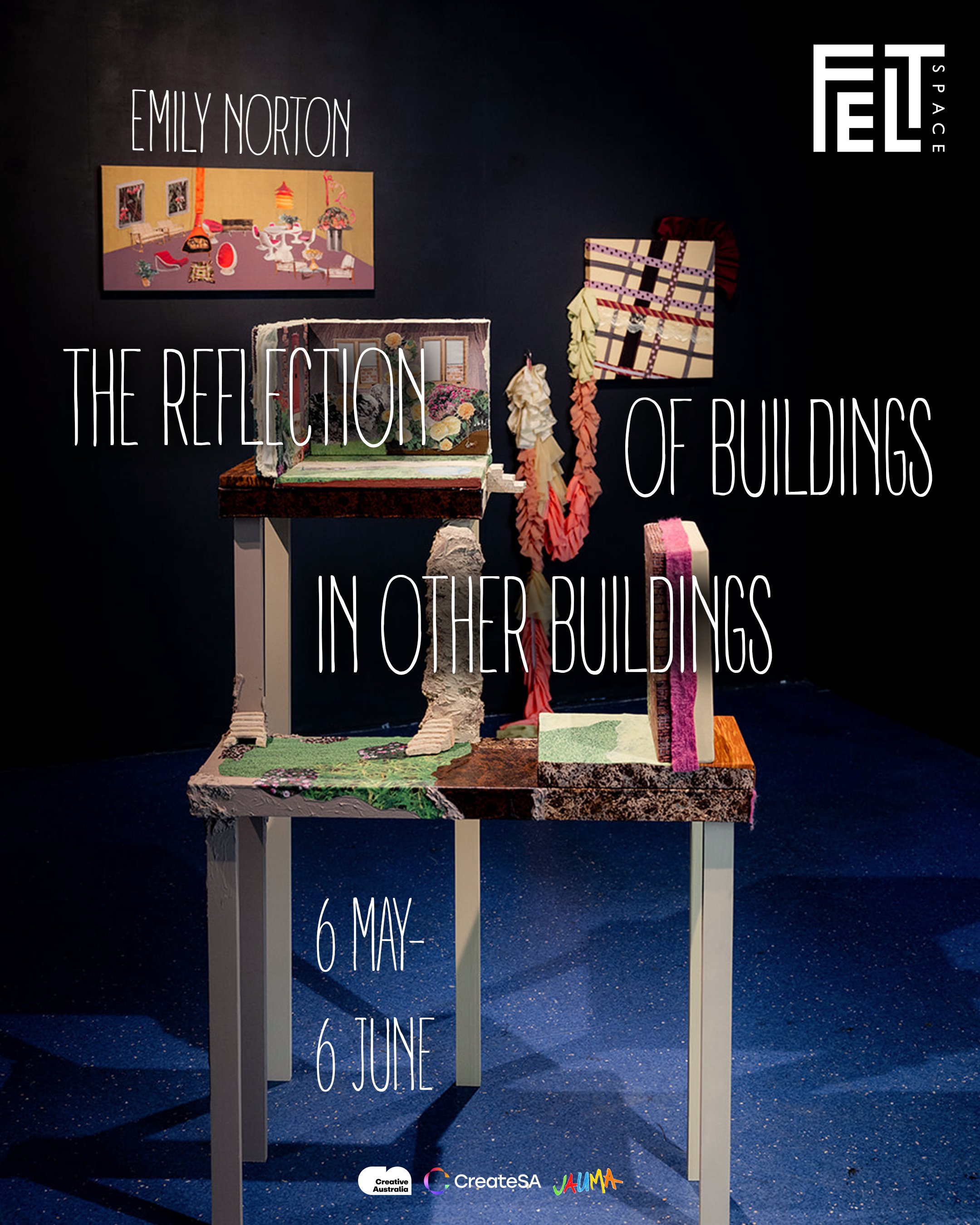 ‘The reflection of buildings in other buildings’ centres around domestic spaces and their replications. Illusory scenes, envisioned as a showroom or stage or screen.